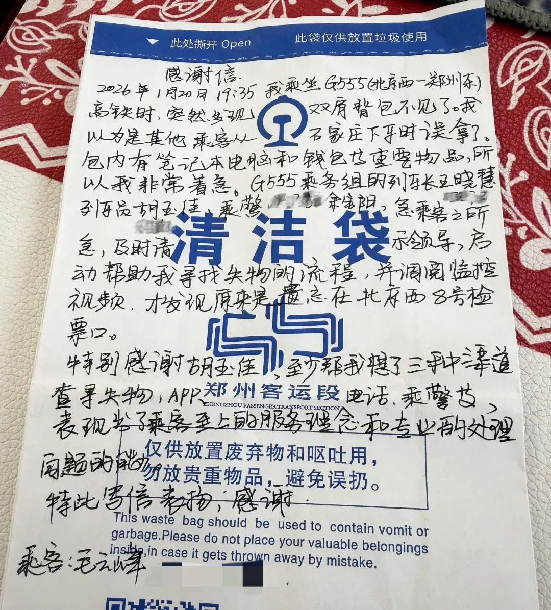 得知背包下落后,毛先生激动不已,多次向胡玉佳表示感谢,并在高铁清洁袋上写下自己的谢意。