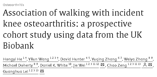 [1]He H, Wang Y, Hunter D, et al. Association of walking with incident knee osteoarthritis: a prospective cohort study using data from the UK Biobank. Ann Rheum Dis. 2025;84(4):632-642. doi:10.1016/j.ard.2025.01.019