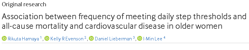 [3]Hamaya R, Evenson KR, Lieberman D, Lee IM. Association between frequency of meeting daily step thresholds and all-cause mortality and cardiovascular disease in older women. Br J Sports Med. Published online October 21, 2025. doi:10.1136/bjsports-2025-110311